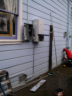 Meanwhile on the ground, REC was installing the inverter, which converts DC to AC. Also pictured here is the DC switch closest and the Sun Run meter furthest away, by the PG&E equipment. The installers were very accommodating about how they installed the equipment and conduit, placing the inverter behind our gate and running the conduit in our crawl space to minimize visual clutter on our house. That said, it is important to put the inverter in a shadier spot as heat from too much sunshine will lower it's efficiency and life span.Well that's it for this installment. Next week rails, panels and hopefully a really big sign on the front of our house that will track the number of houses that are going solar in our project!